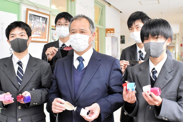 同クラブは、東日本大震災の津波で大きな被害を受けた宮城県の気仙沼向洋高校と交流を続けており、地元のかばん会社から譲り受けた革の端材でミニチュアランドセルを製作。今年は120個を届けた。